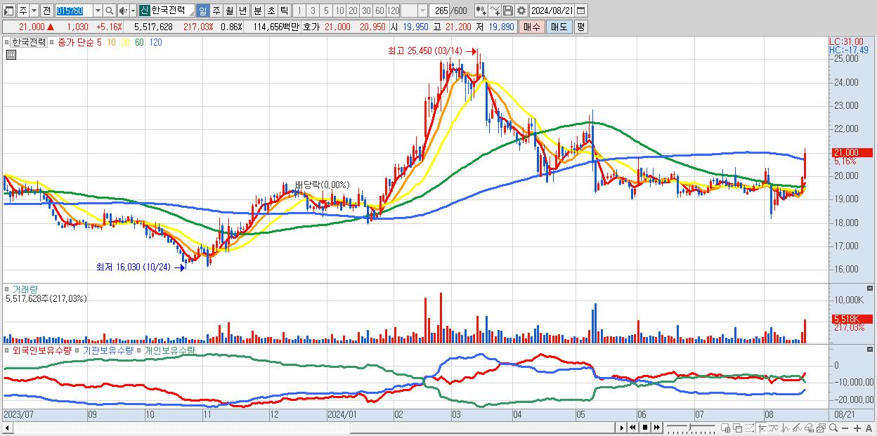 - 한국전력 (21,000원 ▲ 5.16% , 시총: 134,812억, 외국인 순매수 거래금:226억)