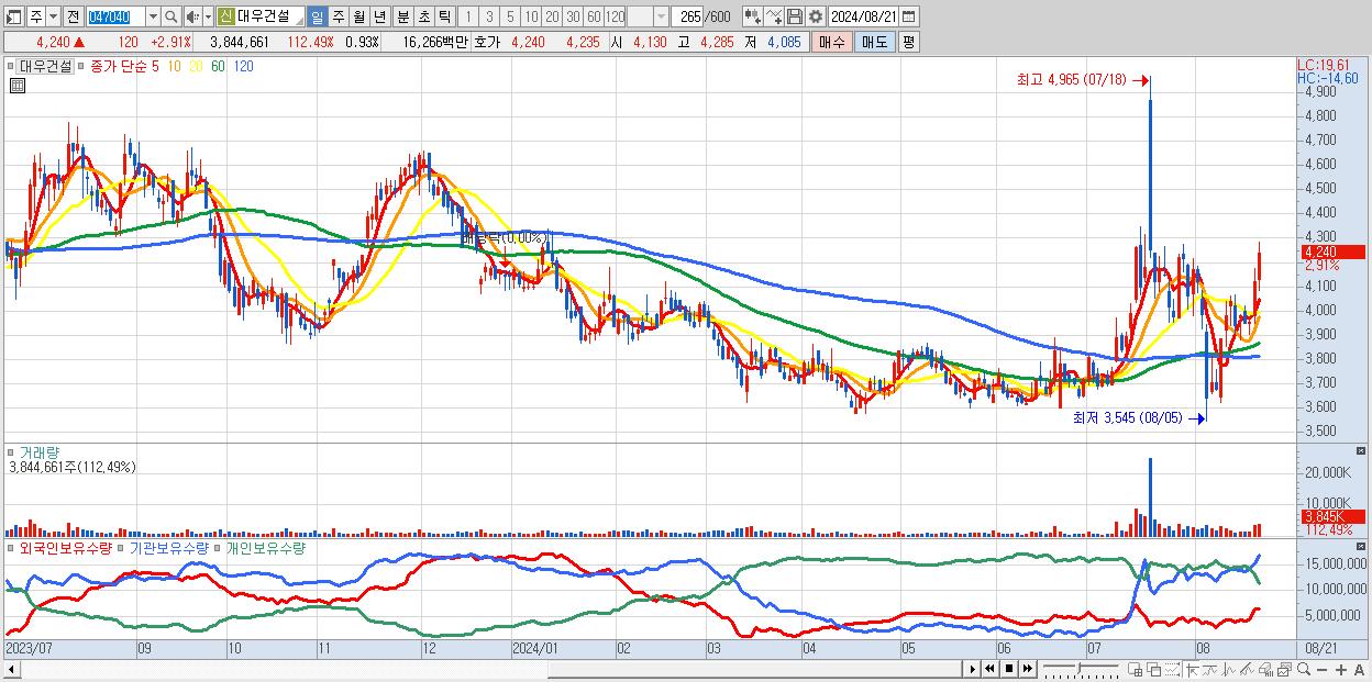 - 대우건설 (4,240원 ▲ 2.91% , 시총: 17,622억, 외국인 순매수 거래금:44억)