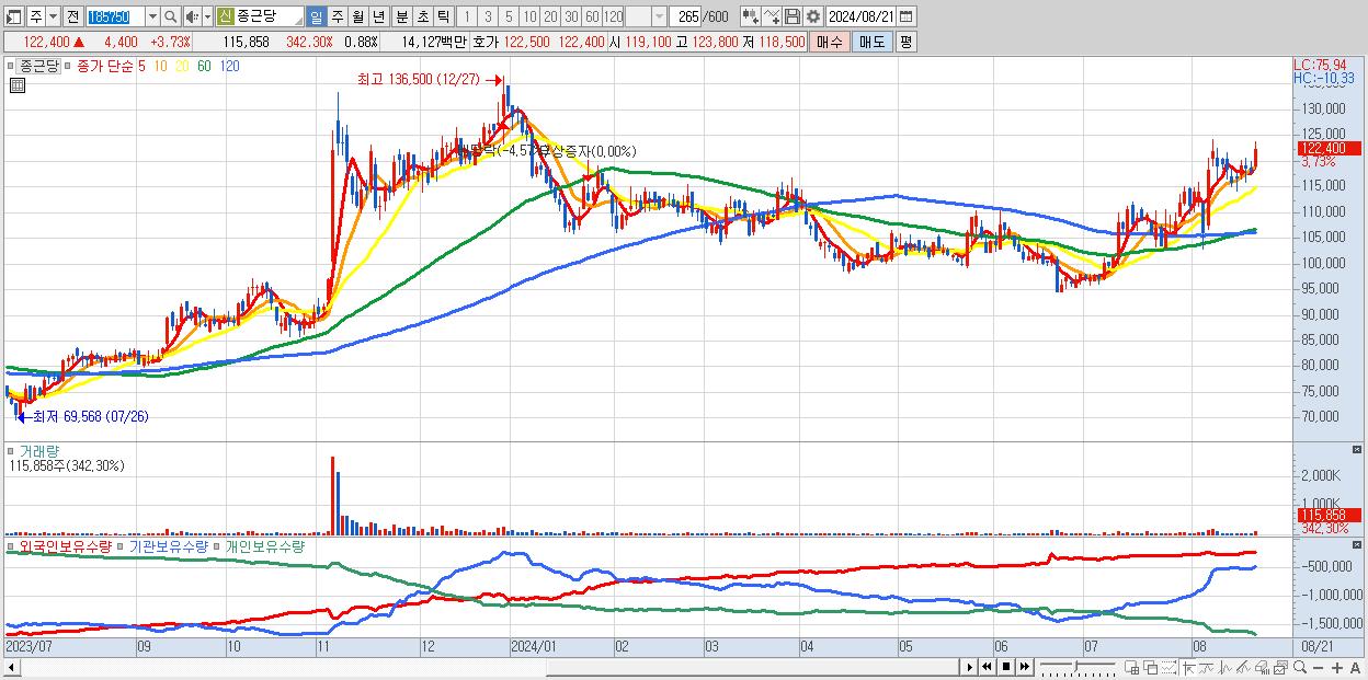 - 종근당 (122,400원 ▲ 3.73% , 시총: 16,125억, 외국인 순매수 거래금:46억)