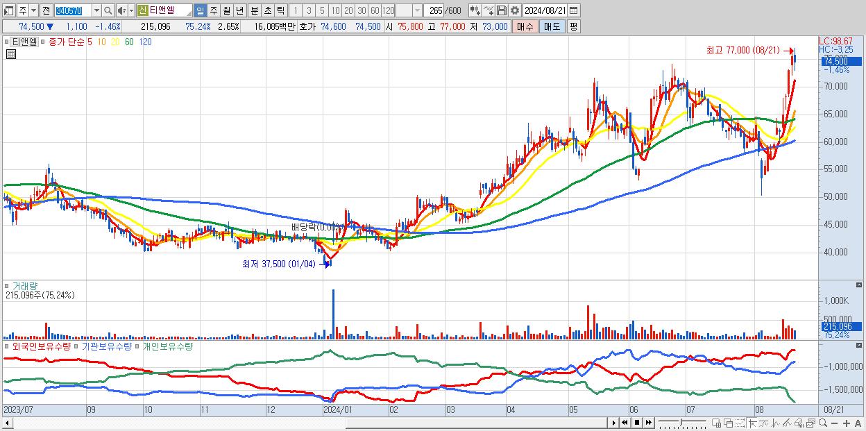 - 티앤엘 (74,500원 ▼ -1.46% , 시총: 6,055억, 외국인 순매수 거래금:46억)