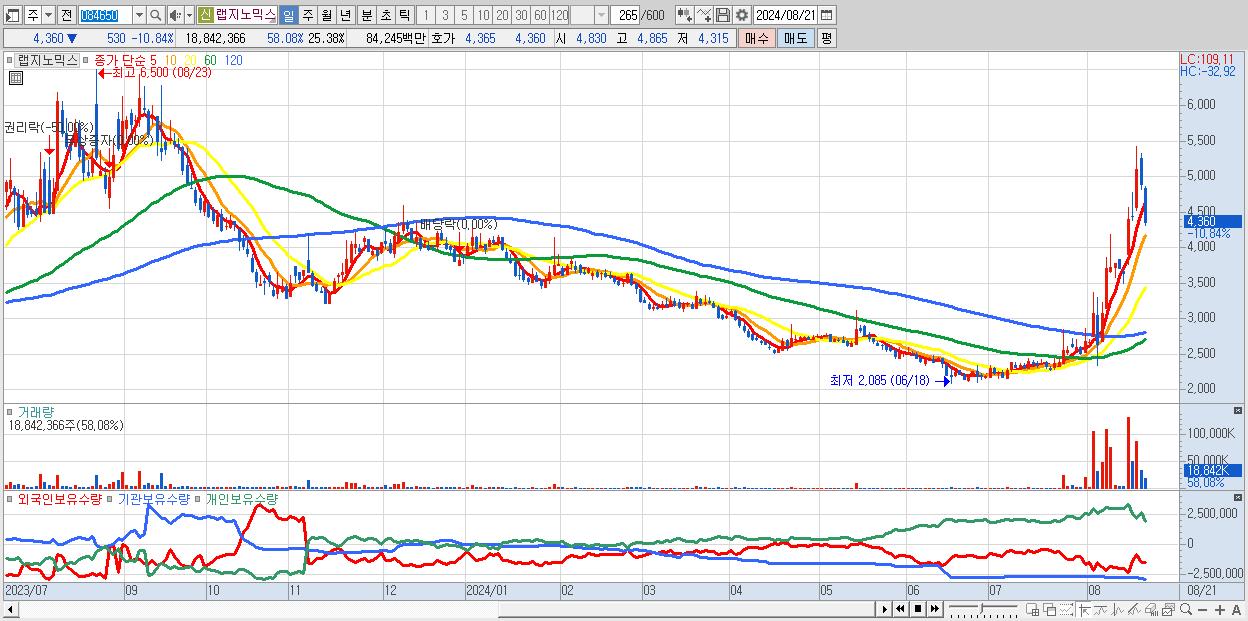- 랩지노믹스 (4,360원 ▼ -10.84% , 시총: 3,237억, 외국인 순매수 거래금:39억)
