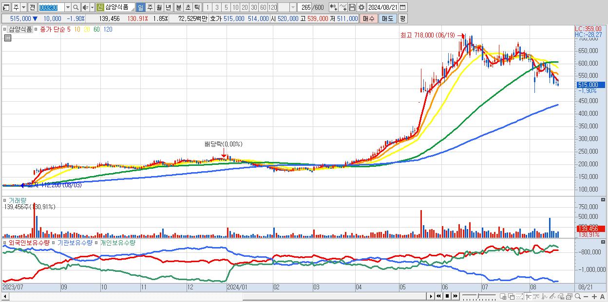 - 삼양식품 (515,000원 ▼ -1.9% , 시총: 38,795억, 외국인 순매수 거래금:57억)