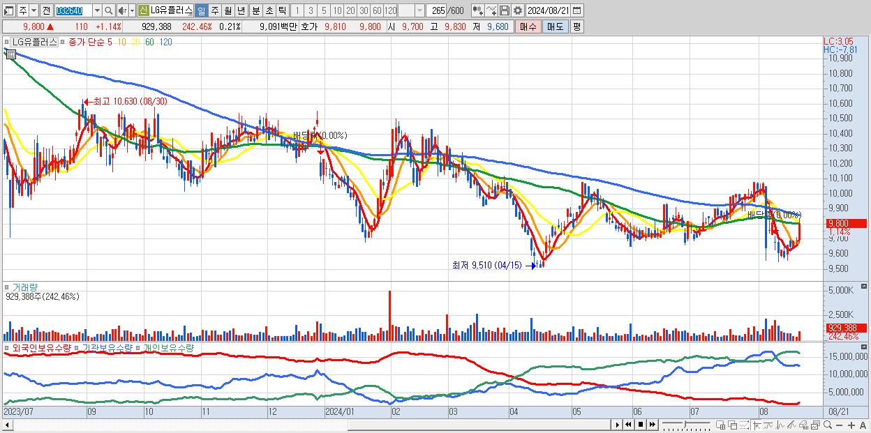 - LG유플러스 (9,800원 ▲ 1.14% , 시총: 42,788억, 외국인 순매수 거래금:42억)