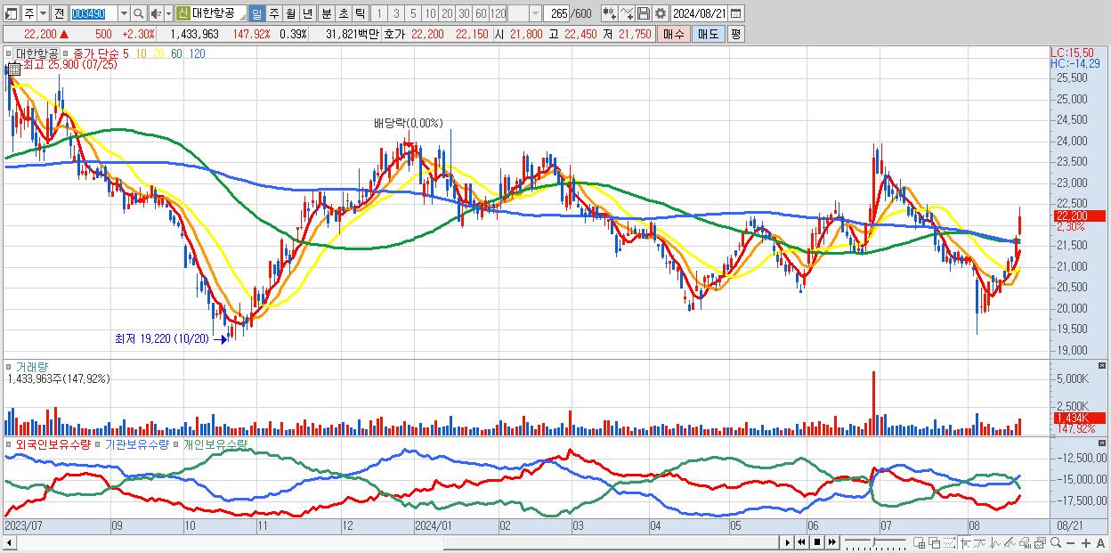 - 대한항공 (22,200원 ▲ 2.3% , 시총: 81,745억, 외국인 순매수 거래금:89억)