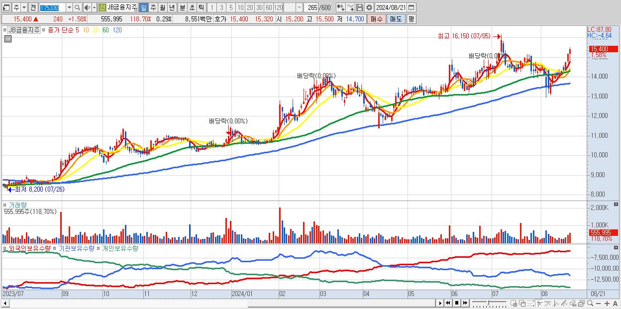 - JB금융지주 (15,400원 ▲ 1.58% , 시총: 30,043억, 외국인 순매수 거래금:42억)