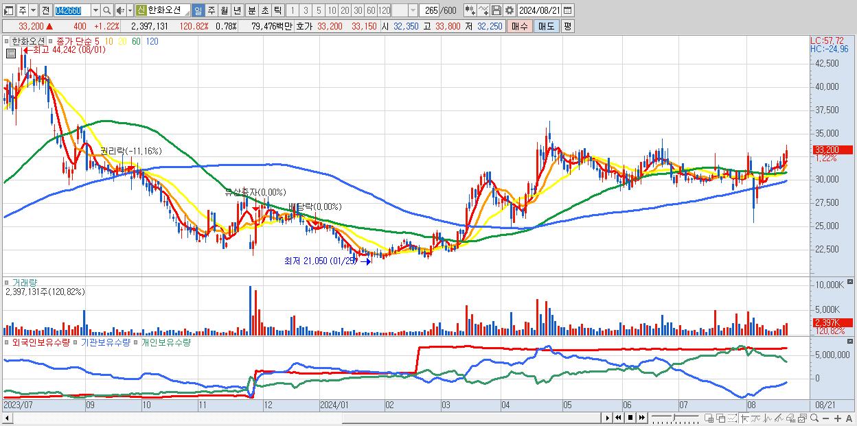 - 한화오션 (33,200원 ▲ 1.22% , 시총: 101,729억, 외국인 순매수 거래금:48억)