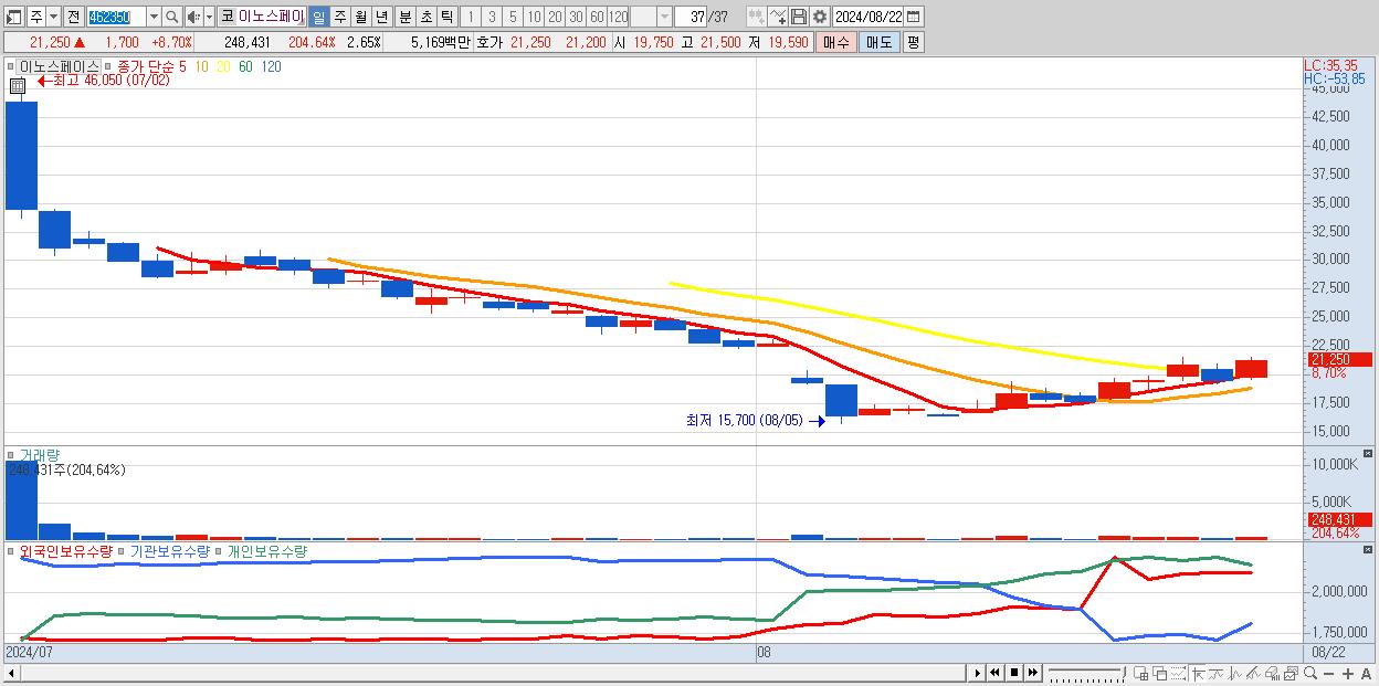- 이노스페이스 (21,250원 ▲ 8.7% , 시총: 1,992억, 거래량: 248,431, 거래대금:52억)