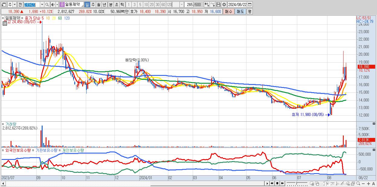 - 일동제약 (18,390원 ▲ 10.12% , 시총: 5,161억, 거래량: 2,812,627, 거래대금:510억)