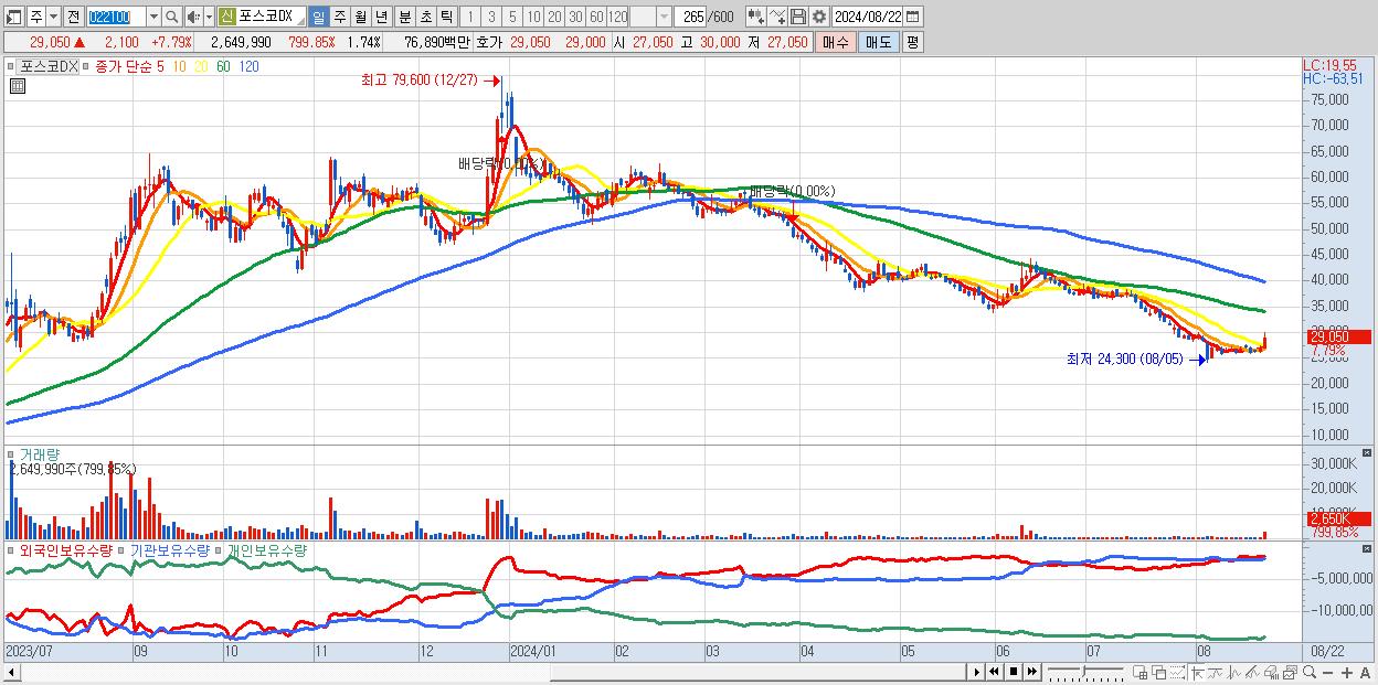 - 포스코DX (29,050원 ▲ 7.79% , 시총: 44,166억, 거래량: 2,649,990, 거래대금:769억)