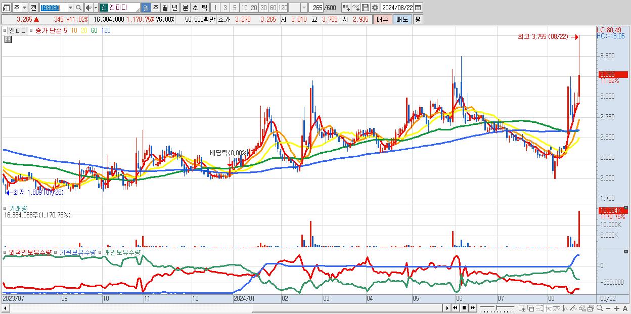 - 엔피디 (3,265원 ▲ 11.82% , 시총: 703억, 거래량: 16,384,088, 거래대금:566억)