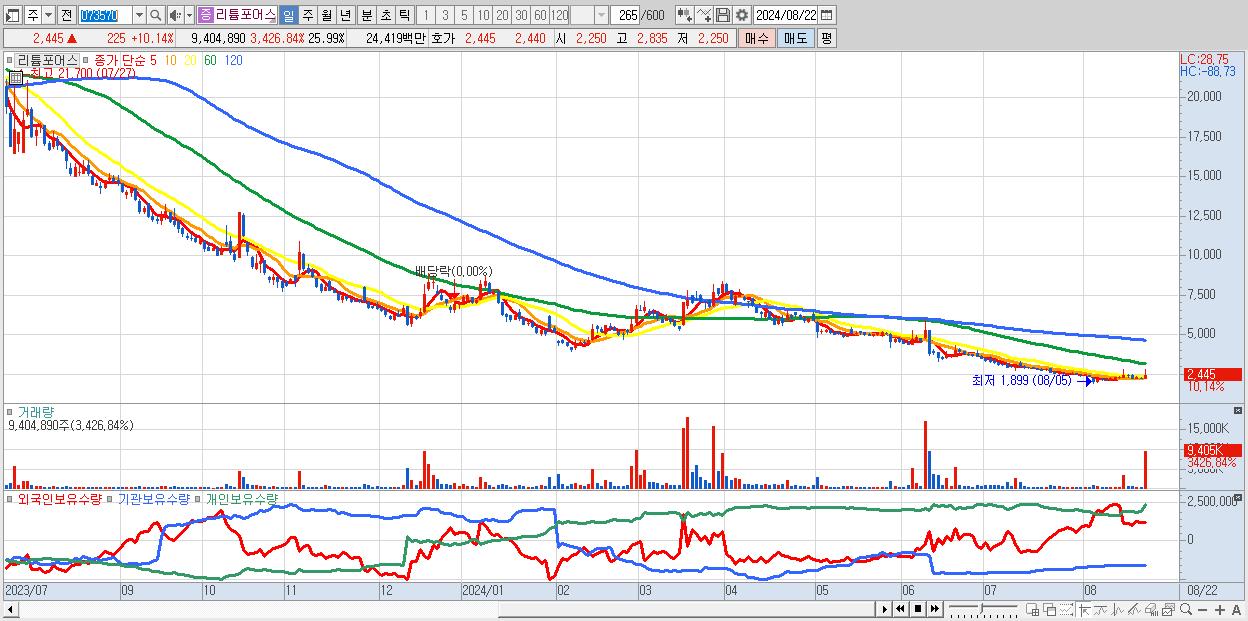 - 리튬포어스 (2,445원 ▲ 10.14% , 시총: 885억, 거래량: 9,404,890, 거래대금:244억)