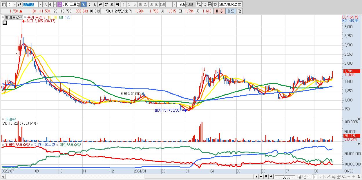 - 에이프로젠 (1,784원 ▲ 11.5% , 시총: 5,039억, 거래량: 29,115,729, 거래대금:504억)