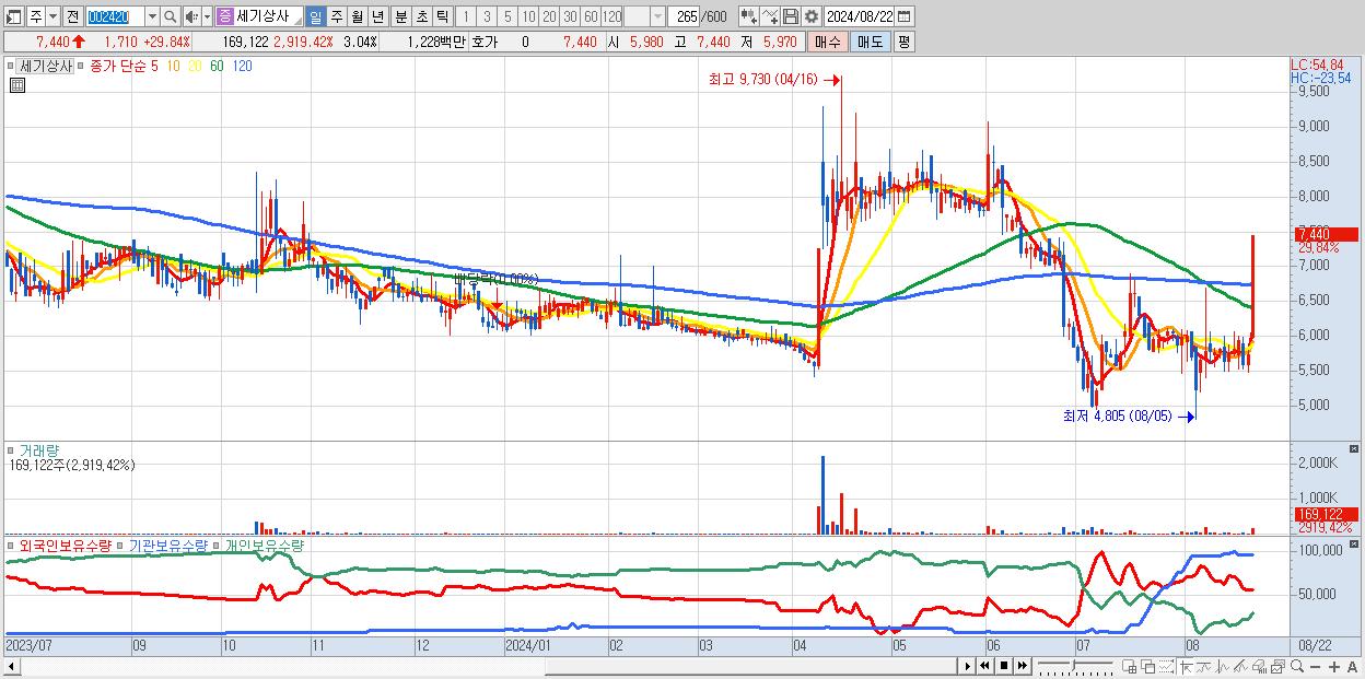 - 세기상사 (7,440원 ▲ 29.84% , 시총: 414억, 거래량: 169,122, 거래대금:12억)