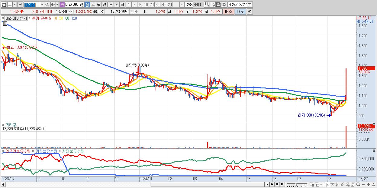 - 미래아이앤지 (1,378원 ▲ 30% , 시총: 398억, 거래량: 13,289,391, 거래대금:177억)