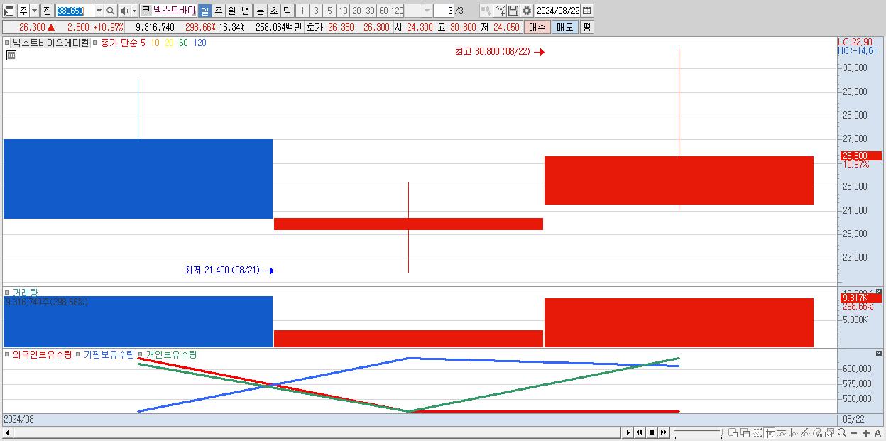 - 넥스트바이오메디컬 (26,300원 ▲ 10.97% , 시총: 2,106억, 거래량: 9,316,740, 거래대금:2,581억)