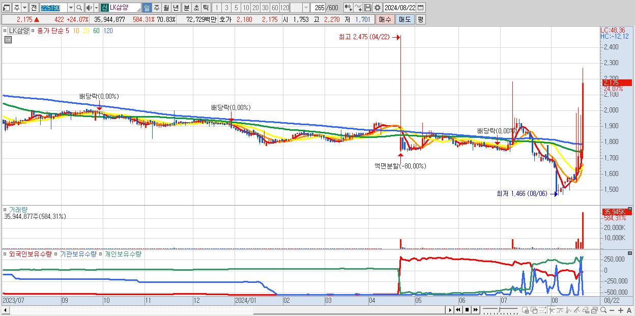 - LK삼양 (2,175원 ▲ 24.07% , 시총: 1,104억, 거래량: 35,944,877, 거래대금:727억)
