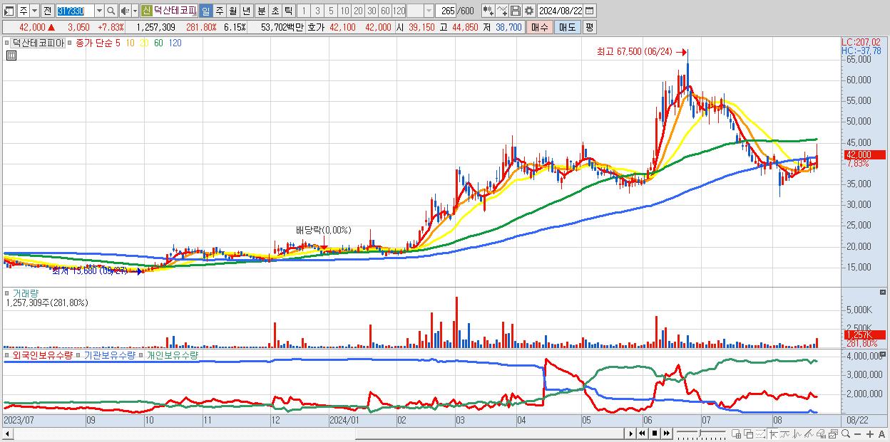 - 덕산테코피아 (42,000원 ▲ 7.83% , 시총: 8,593억, 거래량: 1,257,309, 거래대금:537억)