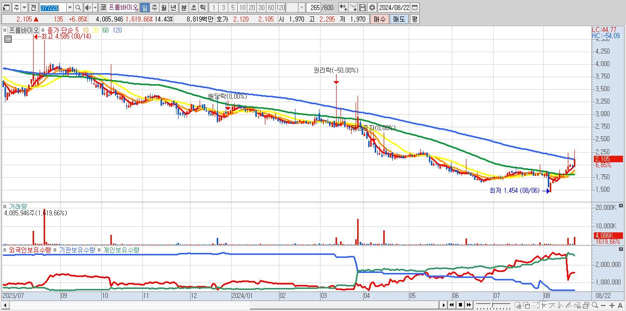- 프롬바이오 (2,105원 ▲ 6.85% , 시총: 596억, 거래량: 4,085,946, 거래대금:88억)