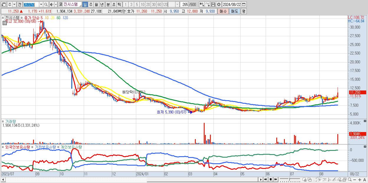 - 진시스템 (11,250원 ▲ 11.61% , 시총: 788억, 거래량: 1,904,134, 거래대금:218억)