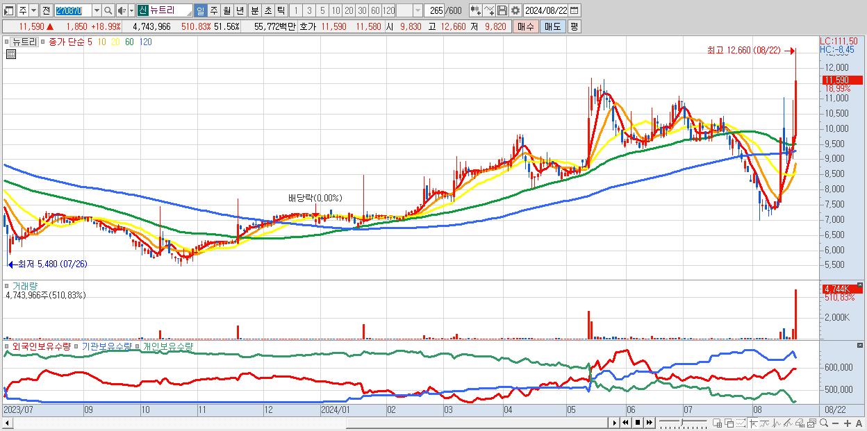 - 뉴트리 (11,590원 ▲ 18.99% , 시총: 1,066억, 거래량: 4,743,966, 거래대금:558억)