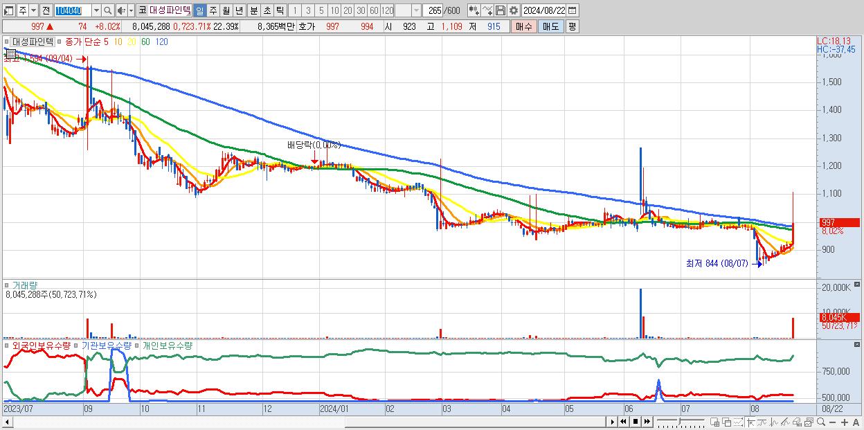 - 대성파인텍 (997원 ▲ 8.02% , 시총: 358억, 거래량: 8,045,288, 거래대금:84억)