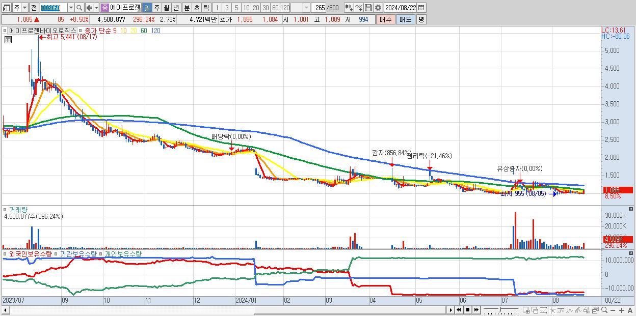- 에이프로젠바이오로직스 (1,085원 ▲ 8.5% , 시총: 1,794억, 거래량: 4,508,877, 거래대금:47억)