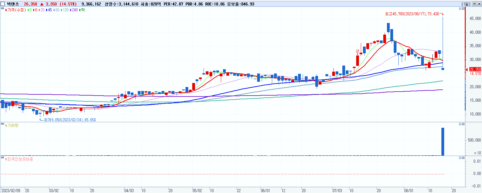 - 빅텐츠 (26,350원 ▲ 14.57% , 시총: 829억, 거래량: 9,375,787, 거래대금:3,408억)