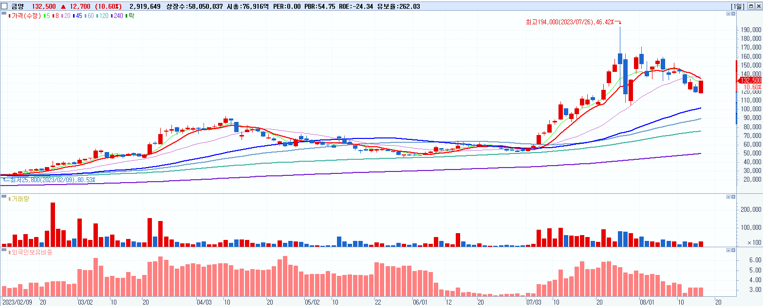 - 금양 (132,500원 ▲ 10.6% , 시총: 76,916억, 거래량: 2,924,467, 거래대금:3,690억)