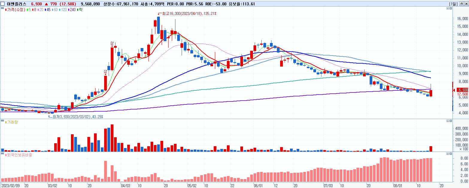 - 이엔플러스 (6,930원 ▲ 12.5% , 시총: 4,710억, 거래량: 9,578,741, 거래대금:675억)