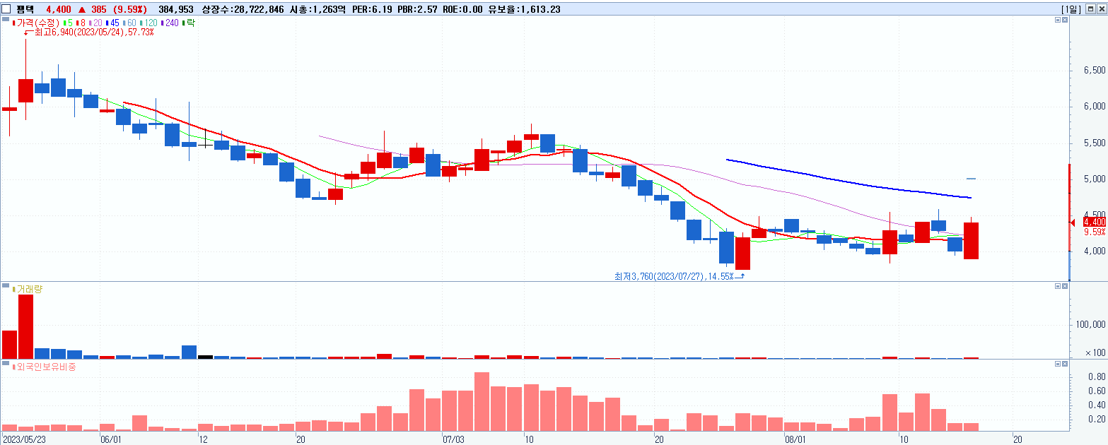 - 팸텍 (4,400원 ▲ 9.59% , 시총: 1,264억, 거래량: 385,865, 거래대금:16억)