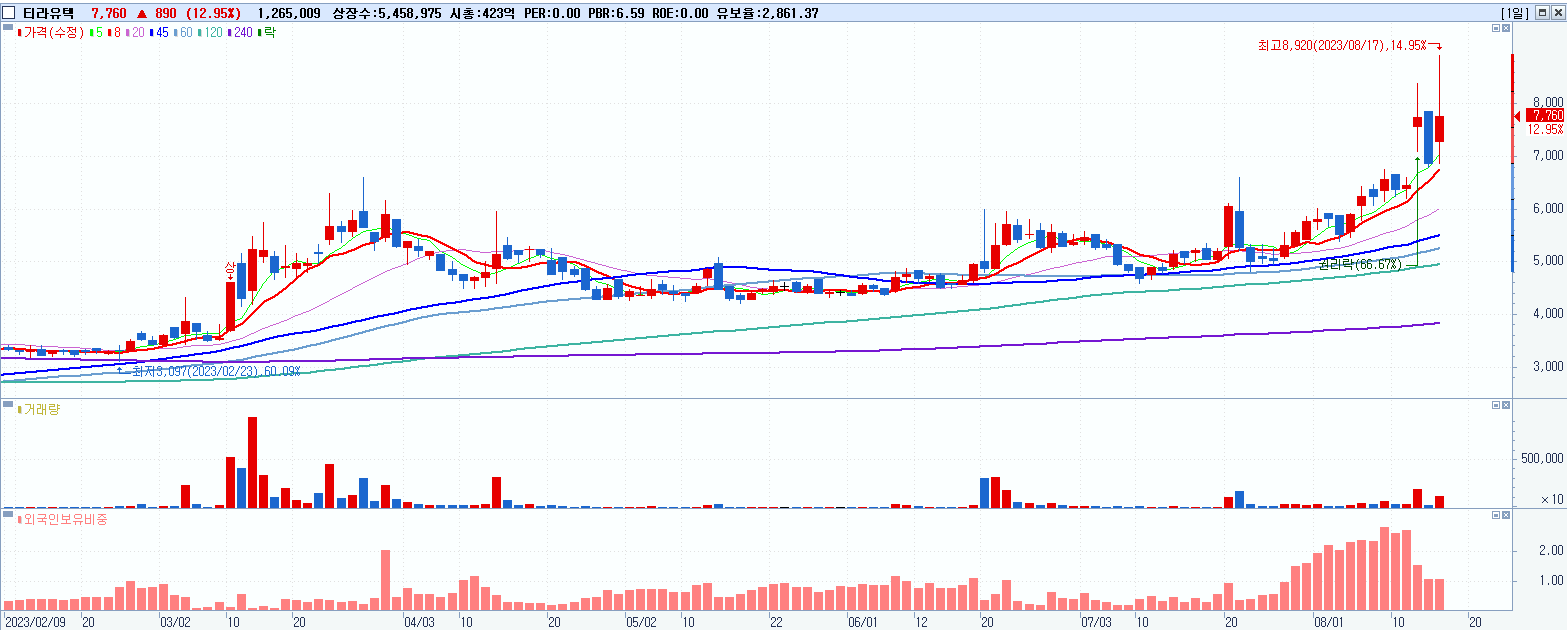 - 티라유텍 (7,760원 ▲ 12.95% , 시총: 424억, 거래량: 1,265,123, 거래대금:102억)