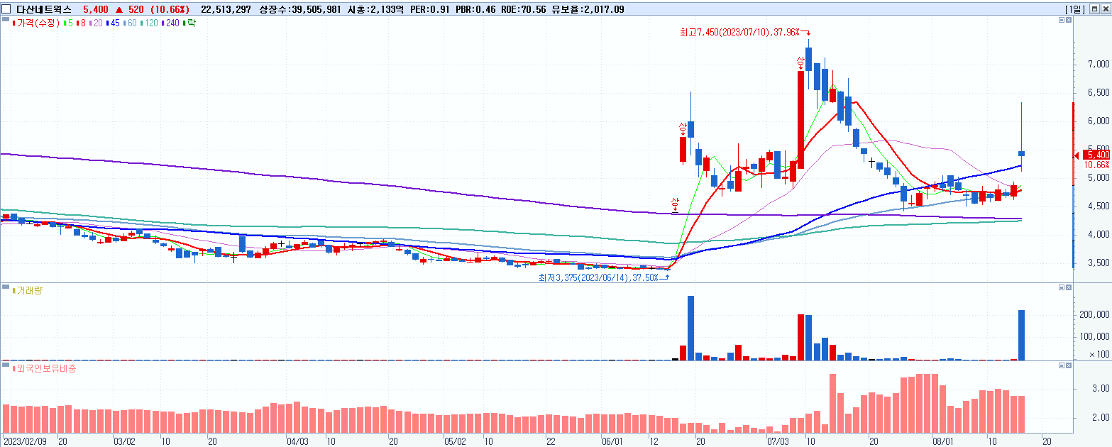 - 다산네트웍스 (5,400원 ▲ 10.66% , 시총: 2,133억, 거래량: 22,537,536, 거래대금:1,314억)
