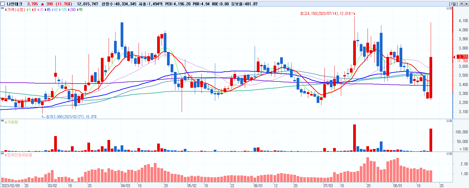 - 나인테크 (3,705원 ▲ 11.76% , 시총: 1,494억, 거래량: 12,122,529, 거래대금:457억)