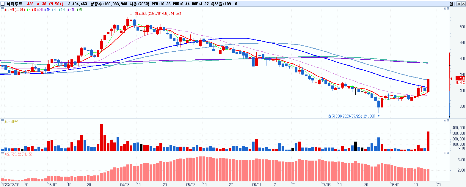 - 에이루트 (438원 ▲ 9.5% , 시총: 705억, 거래량: 3,405,879, 거래대금:15억)