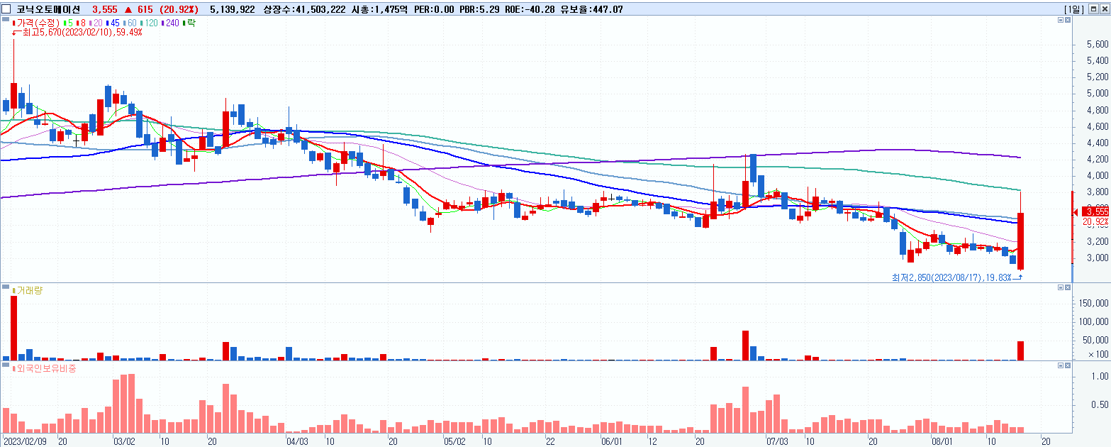- 코닉오토메이션 (3,555원 ▲ 20.92% , 시총: 1,475억, 거래량: 5,187,046, 거래대금:187억)