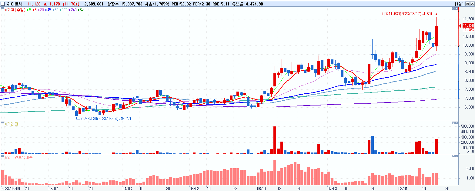 - 하이로닉 (11,120원 ▲ 11.76% , 시총: 1,706억, 거래량: 2,692,803, 거래대금:297억)
