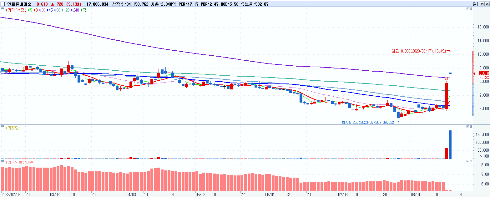 30.인트론바이오 8,610원 ▲ 9.13% (KOSDAQ, 048530)
