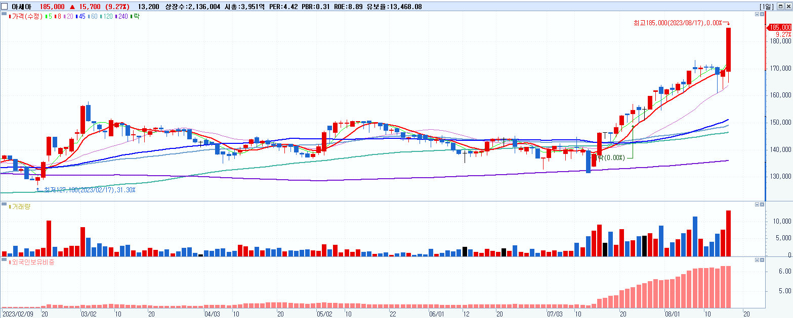 - 아세아 (185,000원 ▲ 9.27% , 시총: 3,952억, 거래량: 13,206, 거래대금:24억)