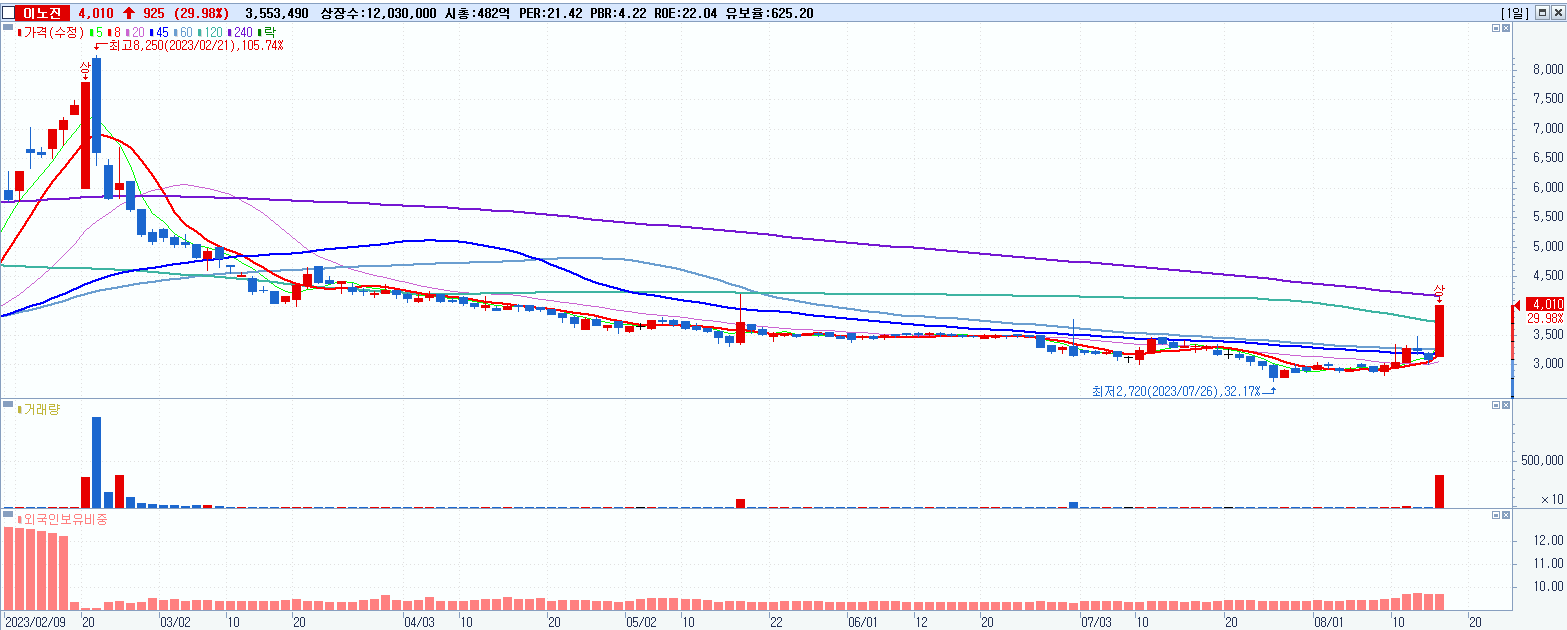 - 이노진 (4,010원 ▲ 29.98% , 시총: 482억, 거래량: 3,553,894, 거래대금:139억)