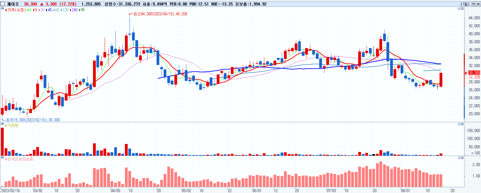 - 제이오 (30,300원 ▲ 12.22% , 시총: 9,495억, 거래량: 1,256,752, 거래대금:370억)