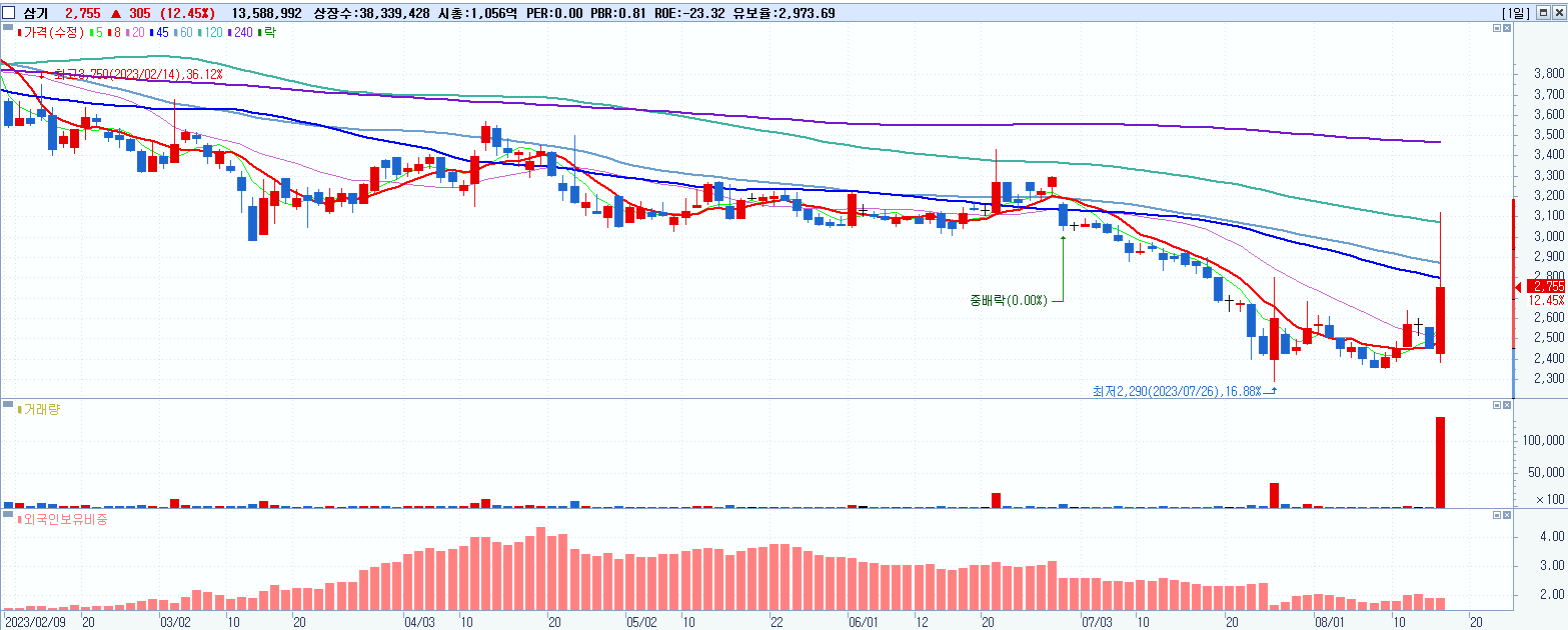 - 삼기 (2,755원 ▲ 12.45% , 시총: 1,056억, 거래량: 13,603,358, 거래대금:393억)