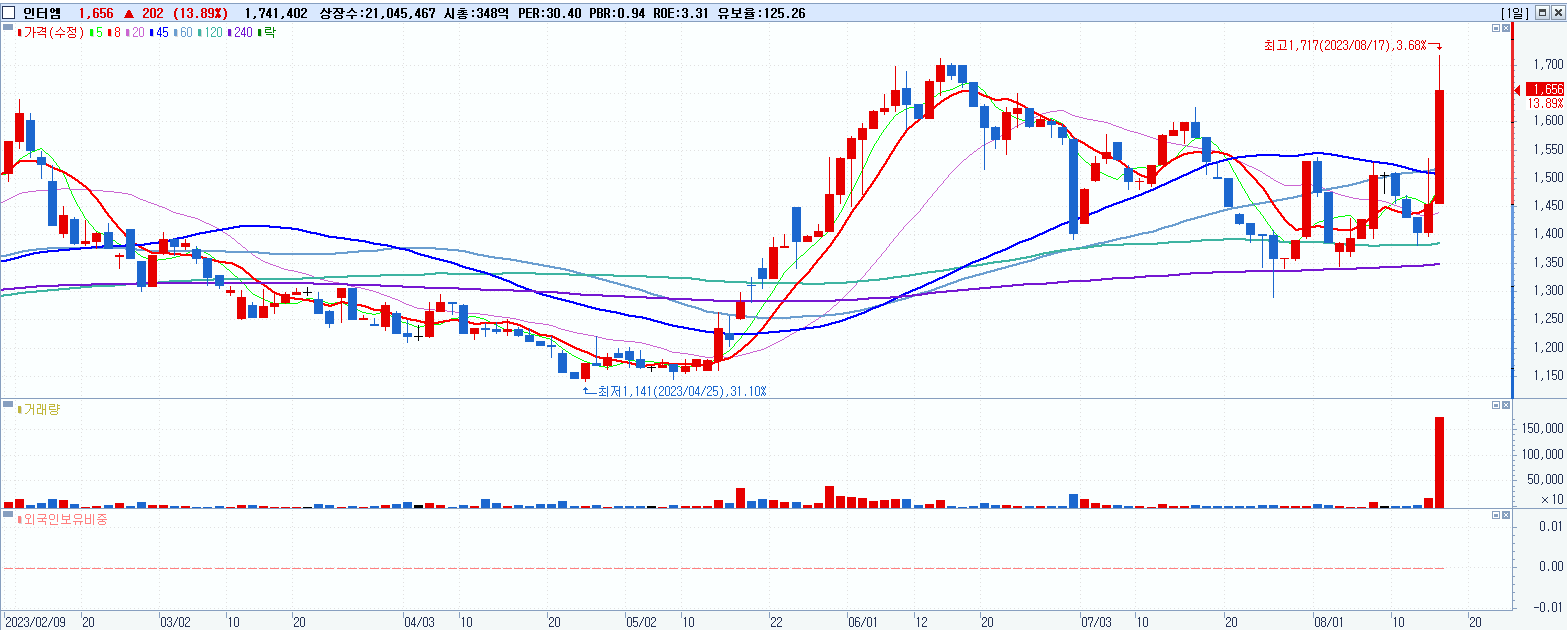 - 인터엠 (1,656원 ▲ 13.89% , 시총: 349억, 거래량: 1,744,052, 거래대금:29억)