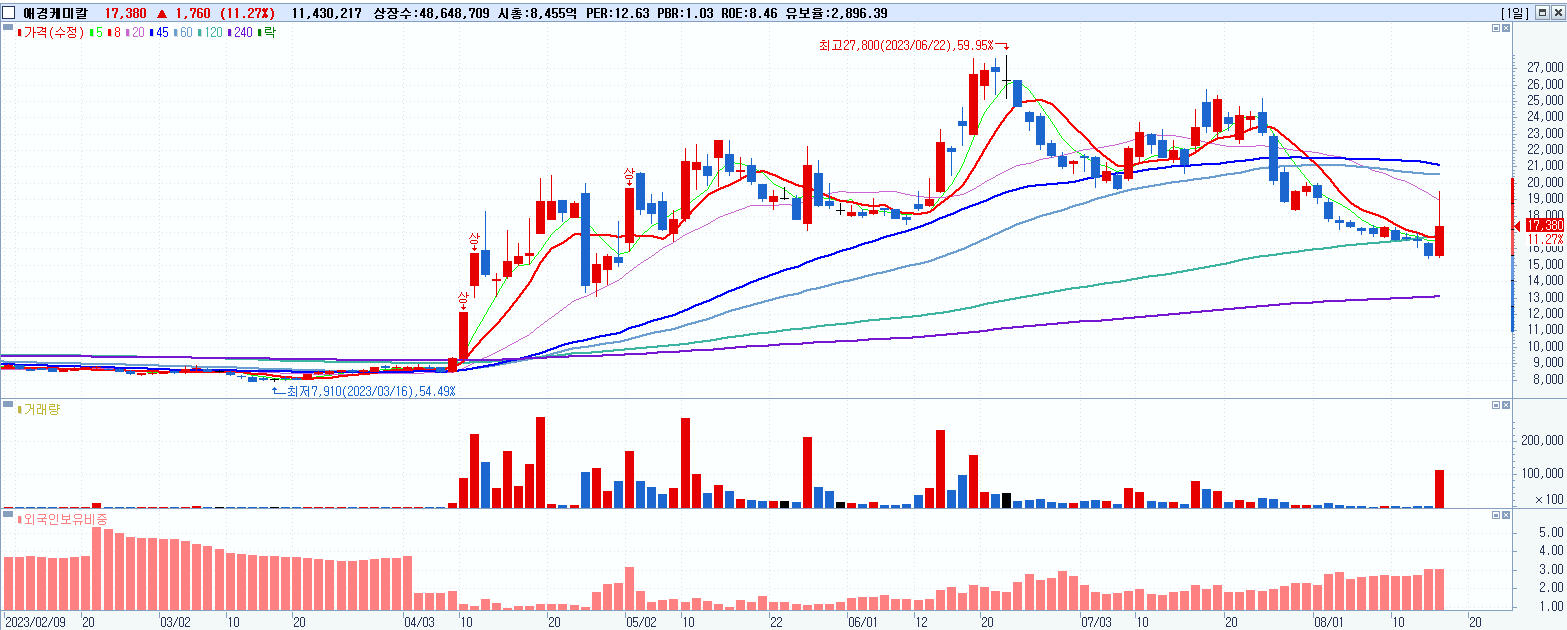 - 애경케미칼 (17,380원 ▲ 11.27% , 시총: 8,455억, 거래량: 11,446,568, 거래대금:2,085억)