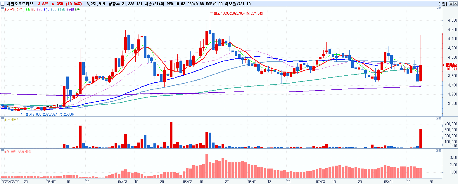 - 서진오토모티브 (3,835원 ▲ 10.04% , 시총: 814억, 거래량: 3,256,225, 거래대금:131억)