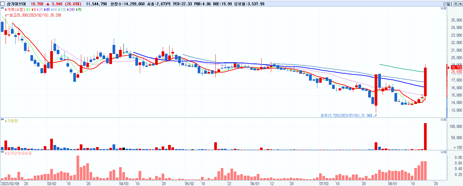 - 삼기이브이 (18,700원 ▲ 26.69% , 시총: 2,674억, 거래량: 11,570,763, 거래대금:2,053억)
