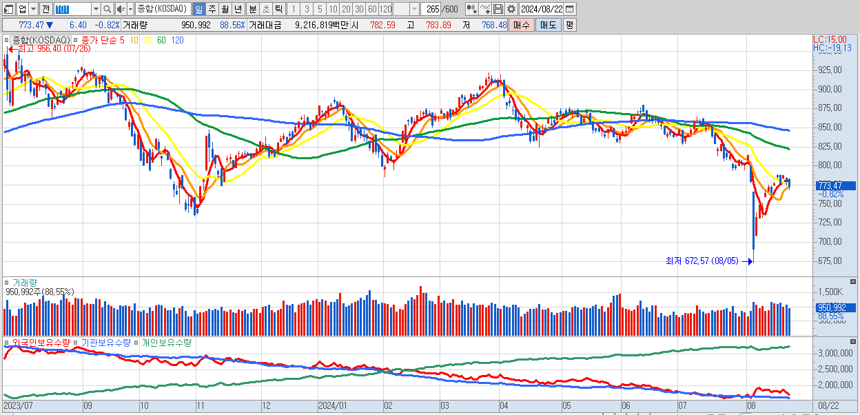 | 08/20 | 787.44 | ▲1.28% | -1,106억 | 1,005억 | 156억 | -55억 |