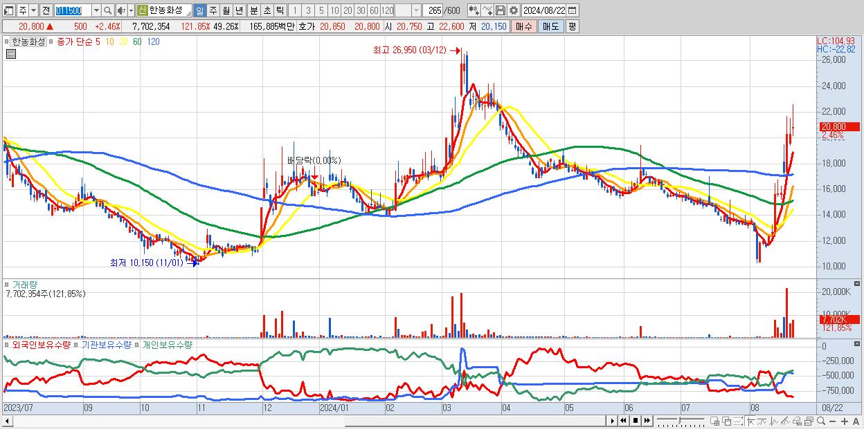 - 한농화성 (20,800원 ▲ 2.46% , 시총: 3,253억, 거래량: 7,702,354, 거래대금:1,659억)