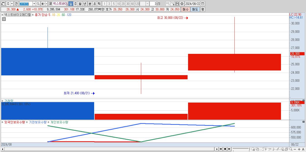 - 넥스트바이오메디컬 (26,300원 ▲ 10.97% , 시총: 2,106억, 거래량: 9,395,594, 거래대금:2,601억)