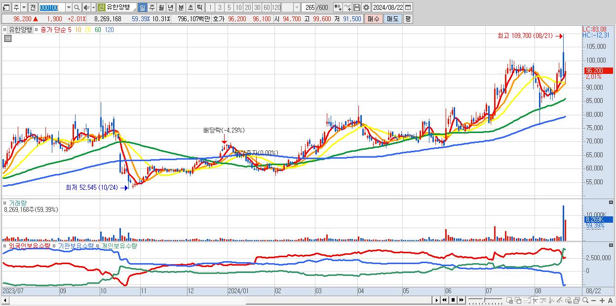2.유한양행 96,200원 ▲ 2.01% (KOSPI, 000100)