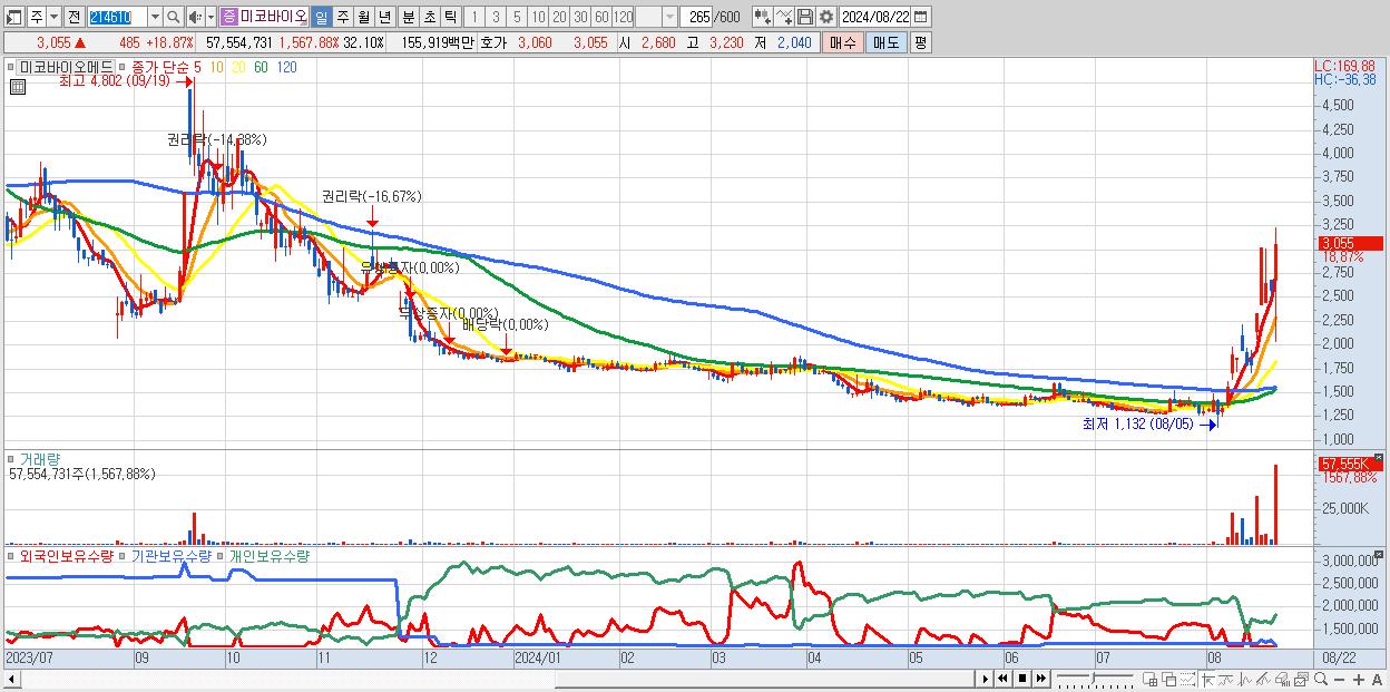 - 미코바이오메드 (3,055원 ▲ 18.87% , 시총: 1,331억, 거래량: 57,554,731, 거래대금:1,559억)